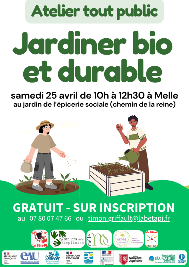Un atelier pratique dans un jardin, où vous serez amené à vous questionner et à pratiquer le jardinage bio et naturel, économe en eau. Prenez des vêtements adéquats ! L’animation est proposée par les Ateliers de la Simplicité. Atelier proposé dans le cadre du programme « Mon Territoire au Fil de l’Eau » du GRAINE Poitou-Charentes.
