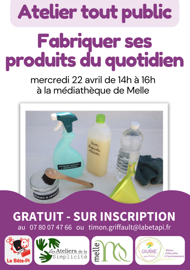 Un atelier de fabrication où chaque participant pourra repartir avec ses produits naturels, biodégradables et sans effet sur l’eau, la santé ou l’environnement. L’animation est proposée par les Ateliers de la Simplicité. Atelier proposé dans le cadre du programme « Mon Territoire au Fil de l’Eau » du GRAINE Poitou-Charentes.