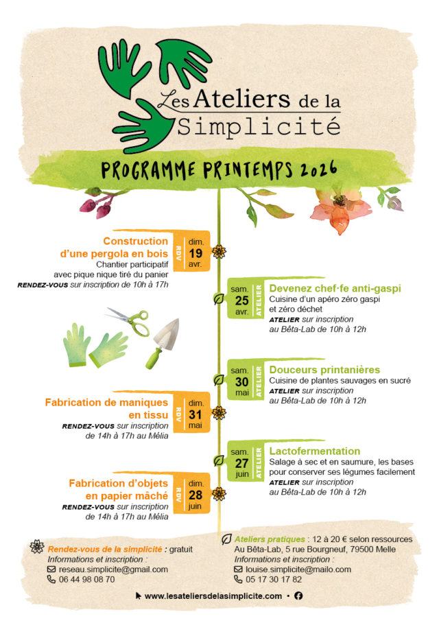 Pour l’inscription à un atelier (payant, chaque dernier samedi du mois à Melle) : 05.17.30.17.82 ou louise.simplicite@mailo.com Pour l’inscription à un rendez-vous (gratuit) : 06.44.98.08.70 ou reseau.simplicite@gmail.com Share on: